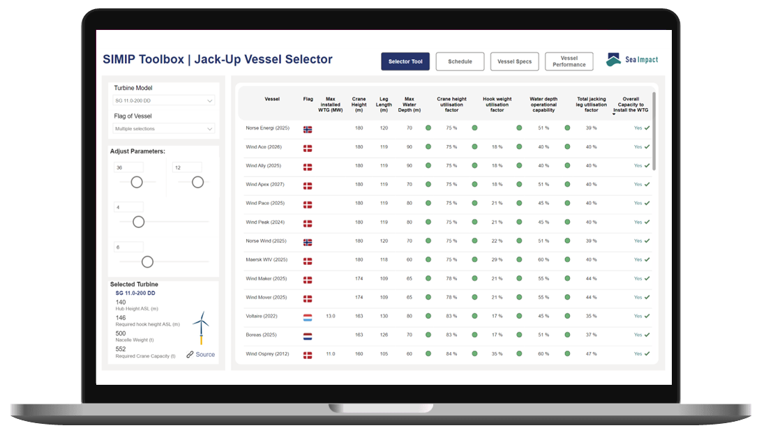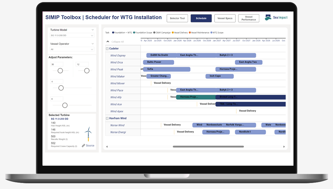 Choose from a wide range of turbine models and foundation components, and the tool will instantly narrow the global fleet to vessels that can execute your project.